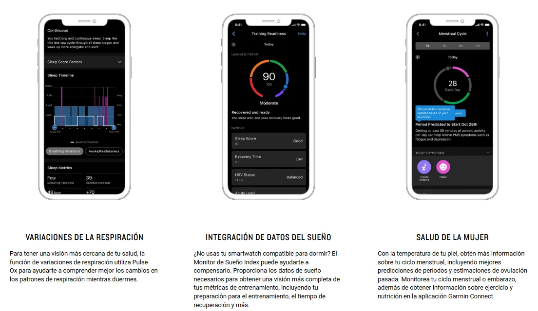 TrueUp™: Sí (sincroniza automáticamente datos de salud y descanso con otros dispositivos Garmin).